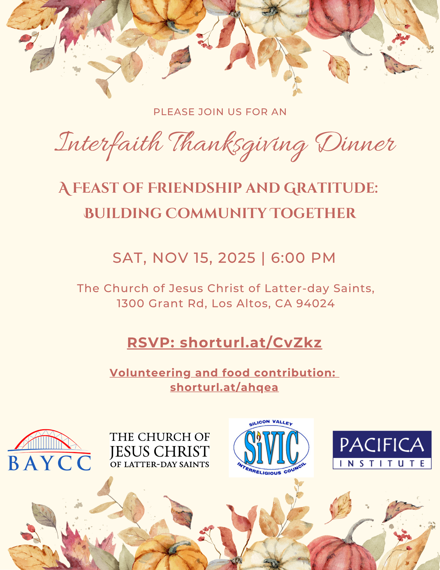 The 2025 Interfaith Thanksgiving Dinner, themed “Feast of Sharing and Gratitude: Building Communities Together,” was held on November 15, 2025, at The Church of Jesus Christ of Latter-day Saints, Los Altos. BAYCC, The Church of Jesus Christ of Latter-day Saints, SiVIC, and Pacifica Institute jointly organized the event. A total of 250 participants attended from diverse faith communities, civic groups, and families across the Bay Area.