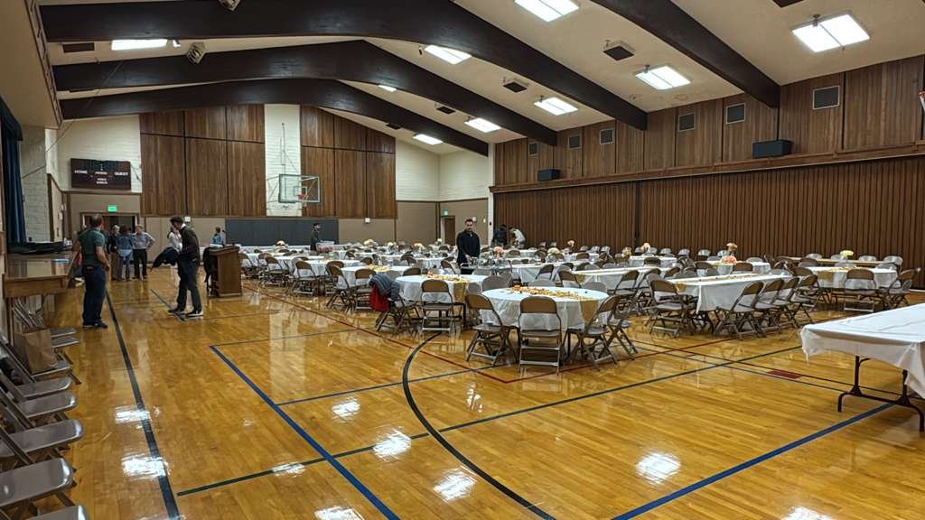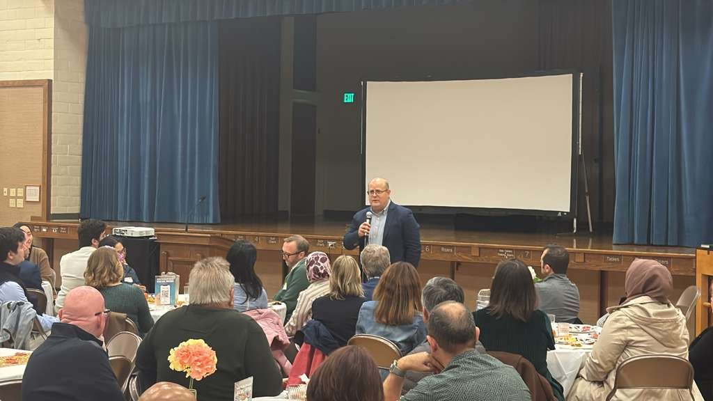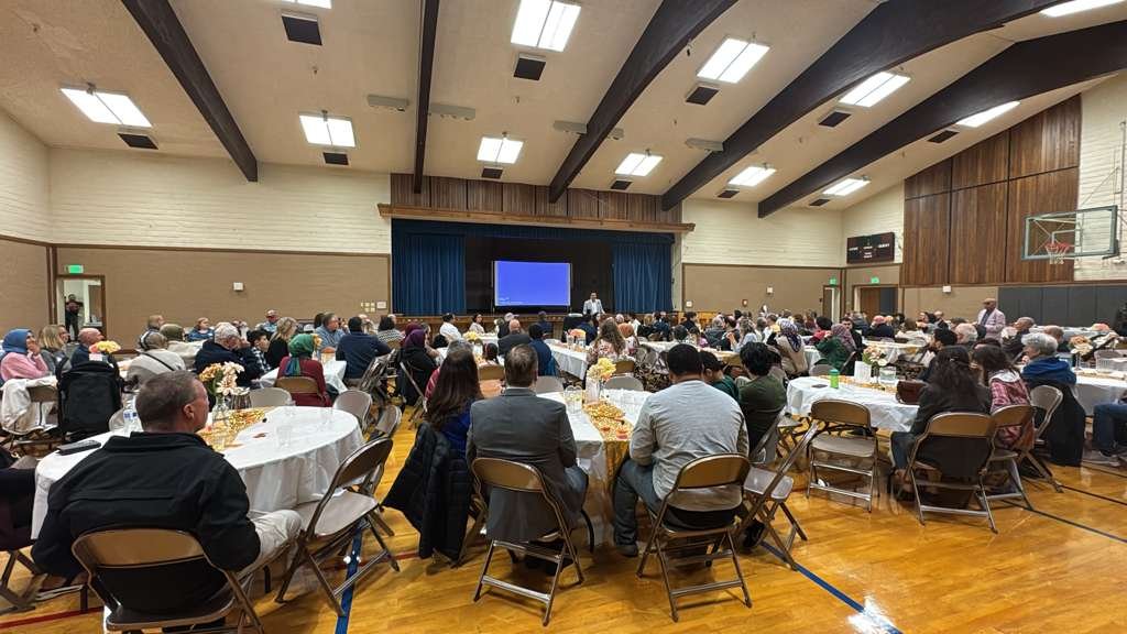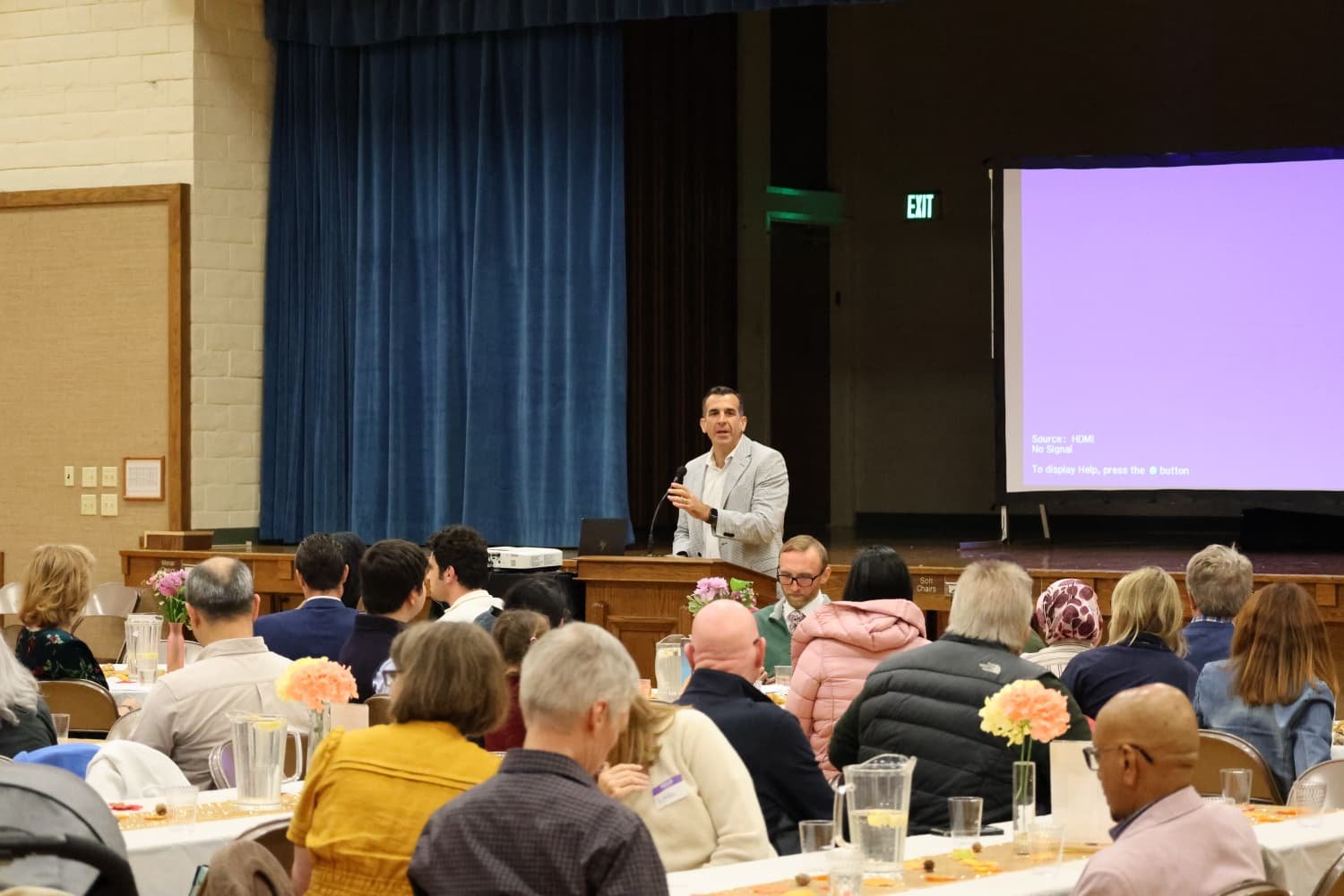 The Thanksgiving turkey was then brought forward, and three blessings were offered by Tina Teng-Henson, Jessica Blitchok, and Yusuf Ozgen. Dinner, including roasted turkey, was enjoyed with live piano music by Jackie Ricks, followed by brief reflections from Garth Pickett and Ibrahim Okuyucu. A musical performance by Joseph and Sarah Cloward preceded closing remarks from Eric Bettinger and a closing prayer from Rev. Pastor Dave Samelson, bringing the evening to a thoughtful close.